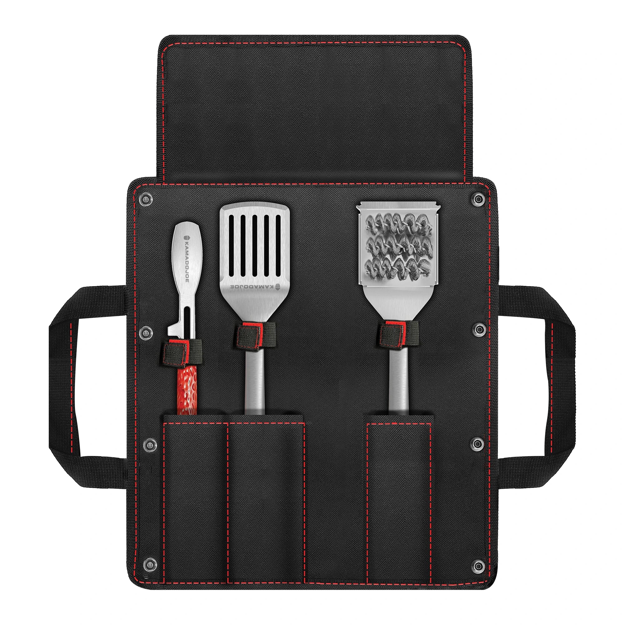 The Kamado Joe Krafted Steel Accessories Kit combines three essential tools: an 18-inch (45.75 cm) spatula, tongs, and grill brush, all forged from heavy-duty stainless steel with ergonomic handles, signature Kamado Joe dimpling, and bold red accents.