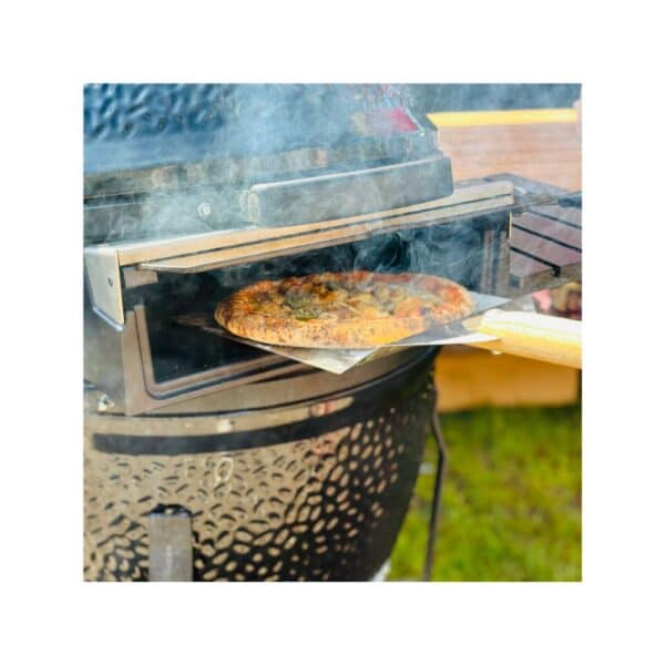 Wat deze accessoire echt onderscheidt is het slimme glasvenster waarmee je het grillproces altijd in de gaten houdt zonder de kamado open te hoeven doen. Zo verlies je geen hitte en hou je de temperatuur constant, wat essentieel is voor perfecte pizzaās met luchtige bodem of langzaam gegaarde kip aan het spit. Daarnaast wordt de PiRO compleet geleverd met alles wat je nodig hebt ā van draaispit en spitvorken tot het driehoekrek en duidelijke instructies ā zodat je direct aan de slag kunt.